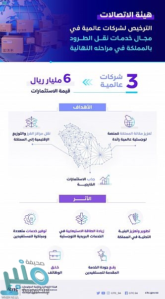 كشفت هيئة الاتصالات وتقنية المعلومات أن منح التراخيص اللازمة لثلاث شركات عالمية للعمل في مجال خدمات نقل الطرود بالمملكة يمر بمراحله النهائية، حيث سيؤدي انضمامها للسوق المحلية إلى ضخ استثمارات تقدر بنحو 6 مليارات ريال.