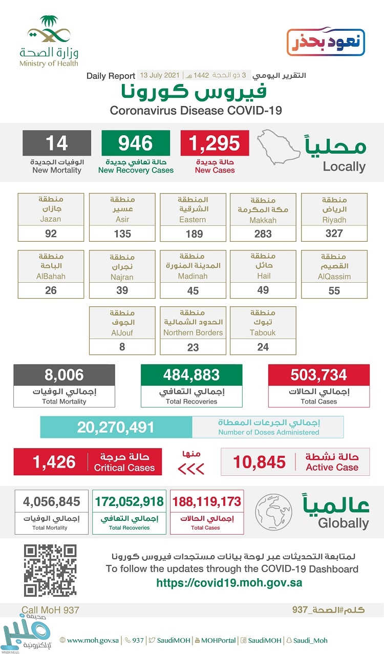 وجاء توزيع حالات الإصابة بمناطق المملكة كالتالي :