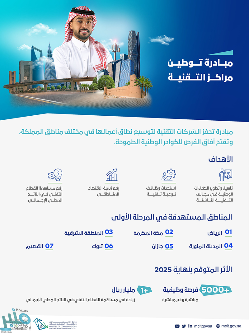تعلن وزارة الاتصالات وتقنية المعلومات عن إطلاق مبادرة (توطين مراكز التقنية) بالتعاون مع (12) شركة سعودية كبرى، وتهدف المبادرة إلى توفير أكثر من (5000) فرصة وظيفية للكوادر الوطنية الطموحة في مختلف مناطق المملكة.