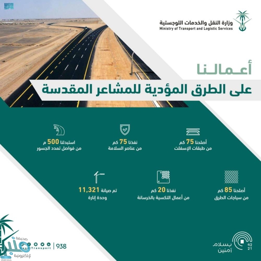 أنجزت وزارة النقل والخدمات اللوجستية العديد من أعمال الصيانة والسلامة على الطرق المؤدية للمشاعر المقدسة؛ استعداداً لموسم حج هذا العام.