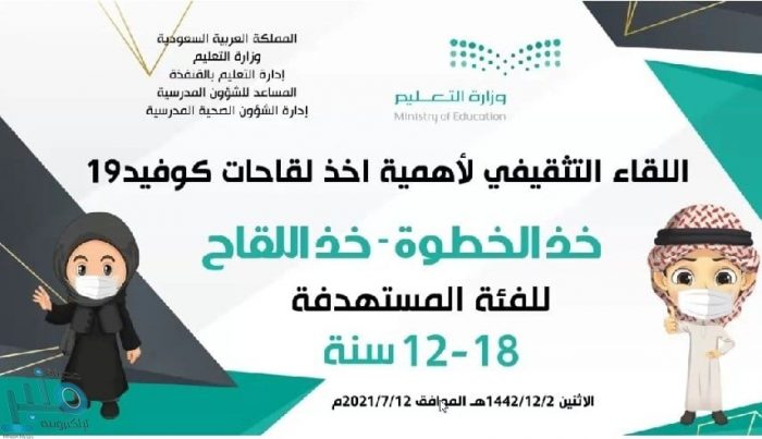 برعاية سعادة مدير تعليم القنفذة بالإنابة الدكتور محمود عبده العلواني، نظمت إدارة تعليم القنفذة لقاءً افتراضيًّا تثقيفيًّا بعنوان “أهمية لقاح كورونا للفئة العمرية 12-18 سنة تحت شعار خذ الخطوة خذ اللقاح.