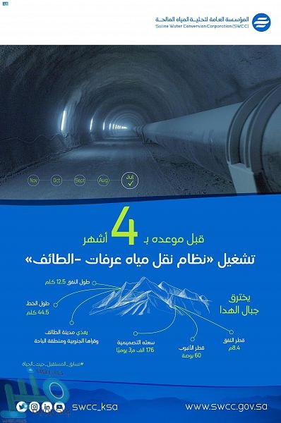 دشنت المؤسسة العامة لتحلية المياه المالحة اليوم، أعمال التشغيل المبكر في أحدث أنظمة نقل المياه المحلاة التابعة لها “نظام نقل مياه عرفات – الطائف”، أحد أهم المشاريع التنموية المائية في المملكة.