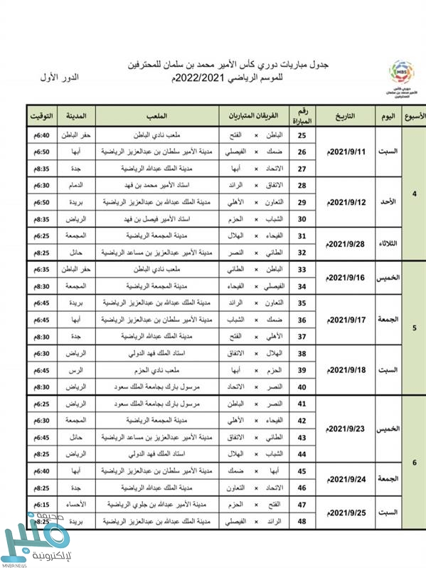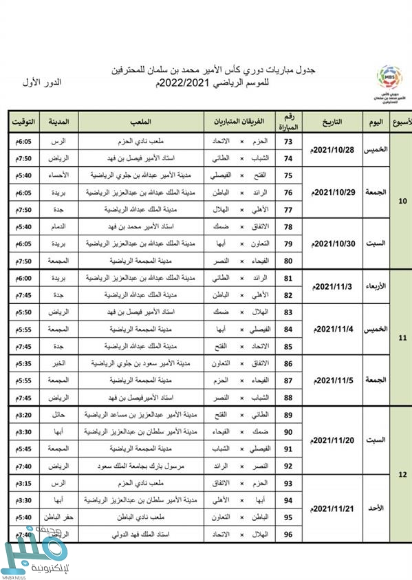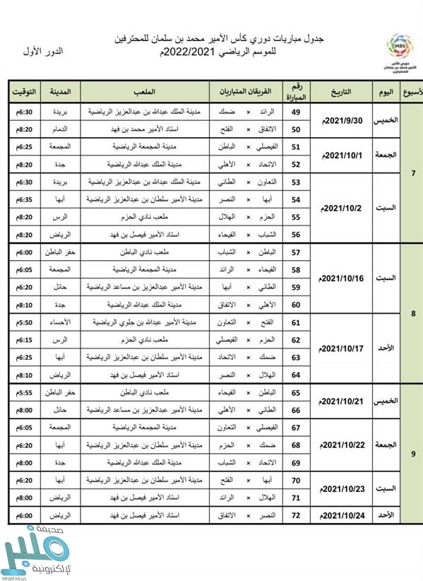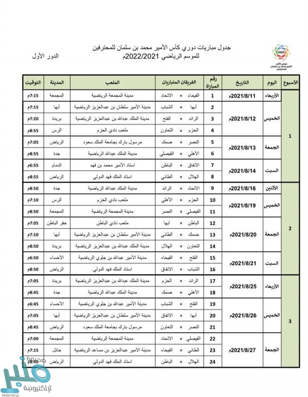 أصدرت لجنة المسابقات في رابطة الدوري السعودي للمحترفين اليوم الأحد 18 يوليو 2021م، جدول مباريات الدور الأول من مسابقة دوري كأس الأمير محمد بن سلمان للمحترفين، للموسم الرياضي 2021/2022م، والذي سينطلق يوم الأربعاء الموافق 11 أغسطس 2021م.