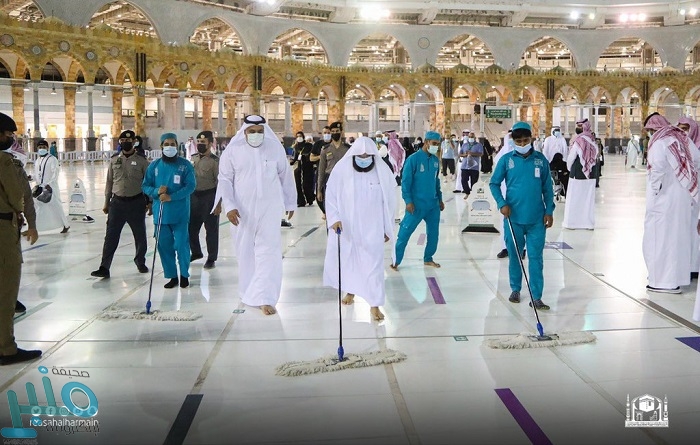 شارك الرئيس العام لشؤون المسجد الحرام والمسجد النبوي الشيخ الدكتور عبدالرحمن بن عبدالعزيز السديس، عمال نظافة الحرم المكي، في تنظيف صحن المطاف .