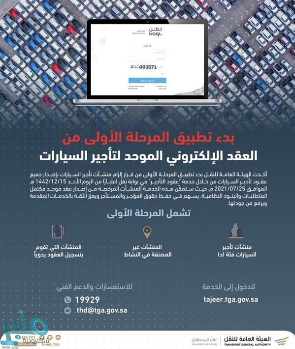 أعلنت الهيئة العامة للنقل بدء تطبيق المرحلة الأولى من قرار إلزام منشآت تأجير السيارات بإصدار جميع عقود تأجير السيارات، من خلال خدمة عقود التأجير في “بوابة نقل” اعتبارًا من اليوم (الأحد).