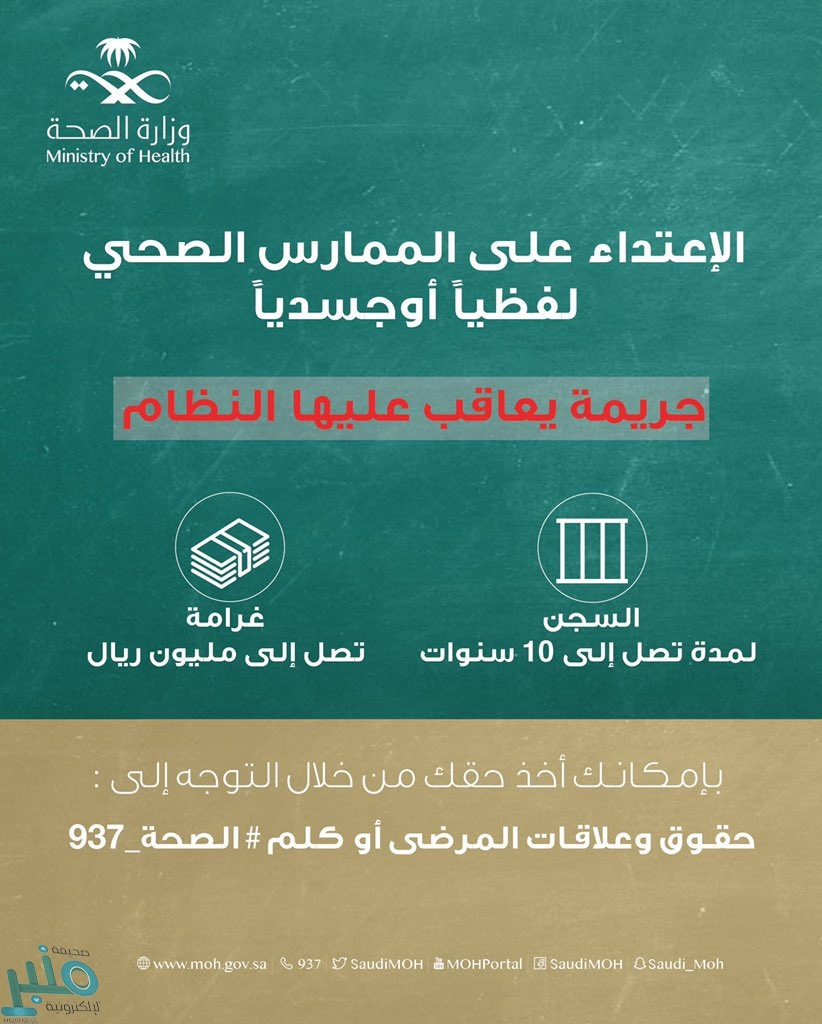 أوضحت وزارة الصحة أن الإعتداء على الممارس الصحي لفظياً أو جسدياً جريمة يعاقب عليها النظام.