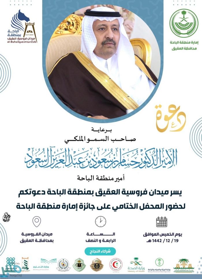 يرعى صاحب السمو الملكي الأمير الدكتور حسام بن سعود بن عبدالعزيز أمير منطقة الباحة ـ حفظه الله -، بعد غدٍ الخميس، الحفل الختامي لسباقات الفروسية للموسم الحالي 1442هـ ، على جائزة إمارة منطقة الباحة، وذلك بميدان فروسية العقيق بمنطقة الباحة.
