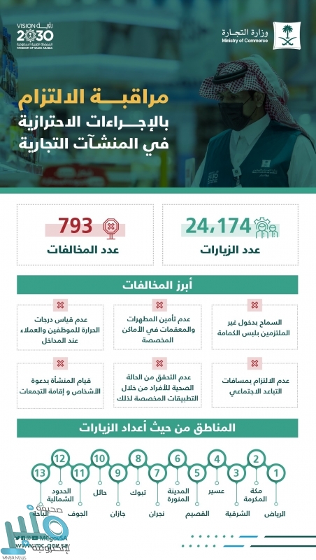 أعلنت وزارة التجارة عن تنفيذ أكثر من 24 ألف زيارة لمتابعة التزام المنشآت التجارية بتطبيق الإجراءات الاحترازية خلال أسبوع، وضبط 793 مخالفة.