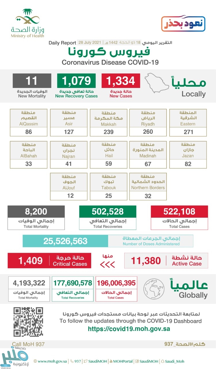 وجاء توزيع حالات الإصابة بمناطق المملكة كالتالي :