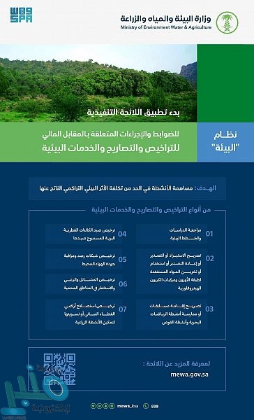 وأفادت الوزارة بأن التراخيص والتصاريح والخدمات البيئية تتنوع ما بين مراجعة الدراسات والخطط البيئية، وترخيص صيد الكائنات الفطرية البرية المسموح صيدها، وترخيص صيد الحيوانات والطيور البرية للأغراض العلمية والبحثية، إضافة إلى تصريح إقامة مسابقات أو ممارسة أنشطة الرياضات البحرية سواء التي تتضمن وسائط ذات محركات أو لا تتضمن، وكذلك أنشطة الغوص، وترخيص الرعي والاستثمار في المناطق المحمية، إلى جانب ترخيص استصلاح أراضي الغطاء النباتي أو تسويتها لتمكين الأنشطة الزراعية، وترخيص المشاتل، والتصاريح المتعلقة بجودة الهواء والضوضاء وغير ذلك.
