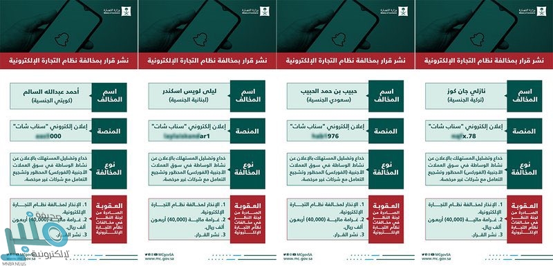 وتم تغريم كلا منهم بمبلغ 40 ألف ريال مع نشر القرار الصادر عن لجنة النظر في مخالفات نظام التجارة الإلكترونية، وهم كالتالي:
