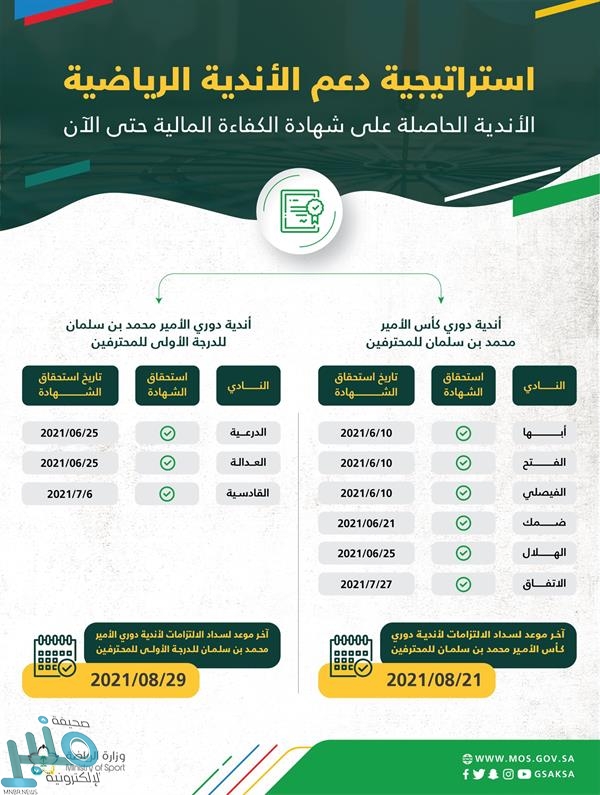 وأوضحت الوزارة أن هناك 3 أندية فقط من دوري الأمير محمد بن سلمان للدرجة الأولى، حصلوا على شهادة الكفاءة المالية، وهم: “الدرعية، العدالة، القادسية”.