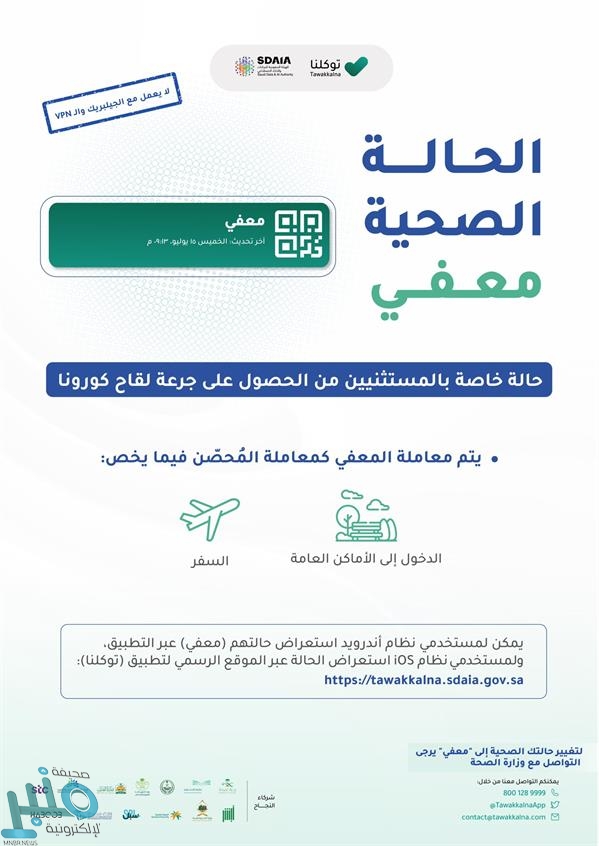 وأكد أن حالة “معفي” تظهر لمن لديه استثناء مسبق من وزارة الصحة بعدم أخذ اللقاح المضاد لفيروس كورونا.