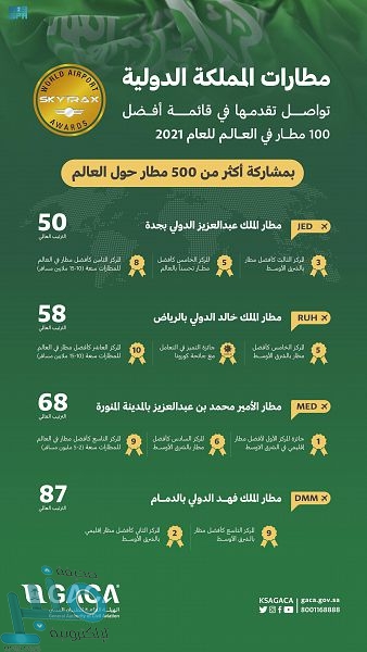 ووفقًا لنتائج التقييم لهذا العام 2021 جاء مطار الملك عبد العزيز الدولي في صدارة المطارات السعودية الدولية في المرتبة الـ50 عالميًا، وتقدم مطار الملك خالد الدولي 36 مرتبة ليصبح في المركز الـ58، ومطار الأمير محمد بن عبد العزيز إلى المركز 68 متقدمًا 16 مركزًا، كما احتل مطار الملك فهد الدولي المركز الـ87 بعد أن كان تصنيفه ال 91 عالميًا.