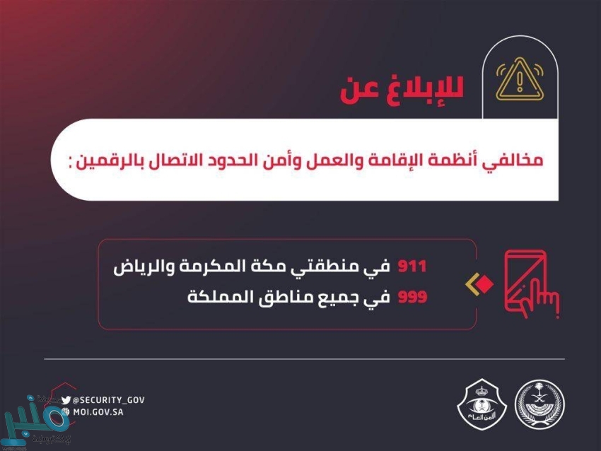 وأوضح الامن العام أن البلاغات من خلال الاتصال بالرقمين: (911) في منطقتي مكة المكرمة والرياض، و (999) في جميع مناطق المملكة.