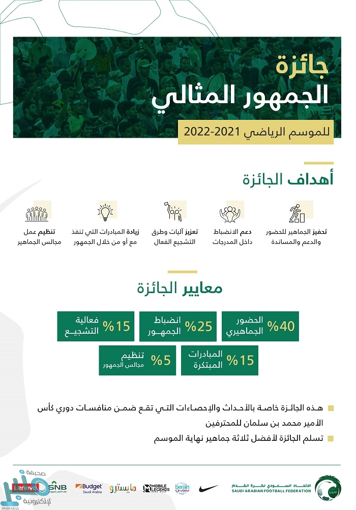 وتأتي هذه الجائزة في سياق اهتمام الاتحاد واللجنة بالجمهور الرياضي في المملكة، خاصة وأن كرة القدم في المملكة تحظى بمتابعة جماهيرية كبرى، وتنافس شريف بين الجماهير لمساندة ودعم المنتخب والأندية بشكل ملحوظ.