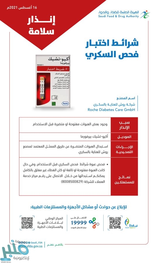 أصدرت الهيئة العامة للغذاء والدواء إنذاراً يخص سلامة بعض شرائط اختبار لفحص السكري من طراز ( أكيو-تشيك بيرفورما) التي تنتجها شركة روش للعناية بالسكري Roche Diabetes Care GmbH، لاحتمالية أن تكون العبوة مفتوحة داخل كرتون مغلق.