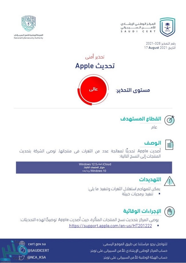ويوصي المركز بتحديث المتصفح إلى نسخة 92.0.4515.159، حيث أصدرت Google توضيحاً للتحديثات اللازمة عبر الرابط: