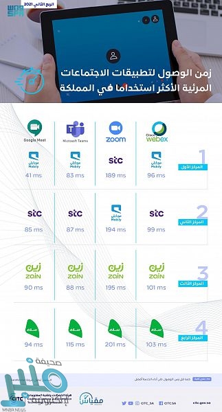 كما أظهر التقرير الربعي تصدّر شركة “موبايلي” قائمة “مقدمي الخدمة الأسرع في زمن الوصول لتطبيقات الاجتماعات المرئية الأكثر استخداماً في المملكة”، بعد تسجيلها أفضل سرعة وصول لتطبيقات: (ويبكس، ومايكروسفت تيمز، وجوجل ميت)، وتصدّر “STC” قائمة “مقدمي الخدمة الأسرع في زمن الوصول لتطبيقات الاجتماعات المرئية الأكثر استخداماً في المملكة” لتطبيق (زوم) خلال الربع الثاني من عام 2021.