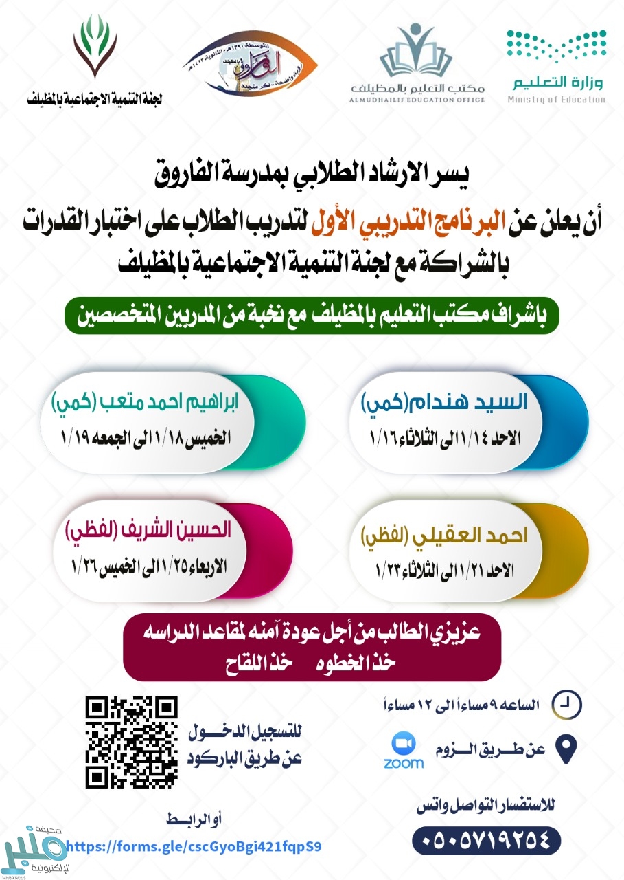 تحت إشراف مكتب تعليم المظيلف، تقيم مدرسة الفاروق الثانوية، بالتعاون مع لجنة التنمية الاجتماعية بالمظيلف، زتحت مظلة الإرشاد الطلابي، دورة في كيفية التعامل مع اختبارات القدرات، يقدمها نخبة من المدربين المحترفين المتخصصين، على مدار 10 أيام تشمل الجانبين اللفظي والكمي.