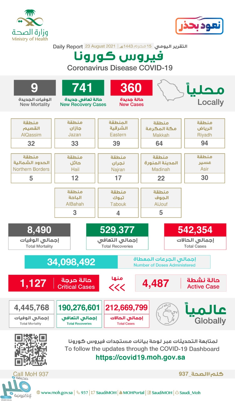 وأضافت الصحة أن إجمالي حالات المصابين في المملكة وصل إلى 542354 حالة حتى الآن ، ووصل مجموع المتعافين إلى 529377 حالة ، فيما بلغ إجمالي الوفيات 8490 حالة وفاة .