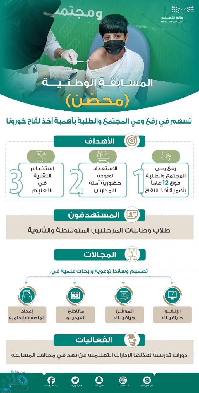 اختتمت وزارة التعليم المسابقة الوطنية الطلابية “محصّن”، التي أطلقتها ضمن برنامج “نشاطي” الصيفي؛ للمساهمة في رفع وعي المجتمع بشكل عام، وطلبة المرحلتين المتوسطة والثانوية بأهمية الحصول على لقاح كورونا، وذلك استعداداً لعودة حضورية آمنة.