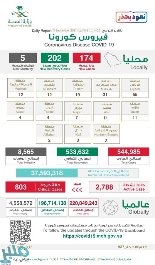 وجاء توزيع حالات الإصابة بمناطق المملكة كالتالي :