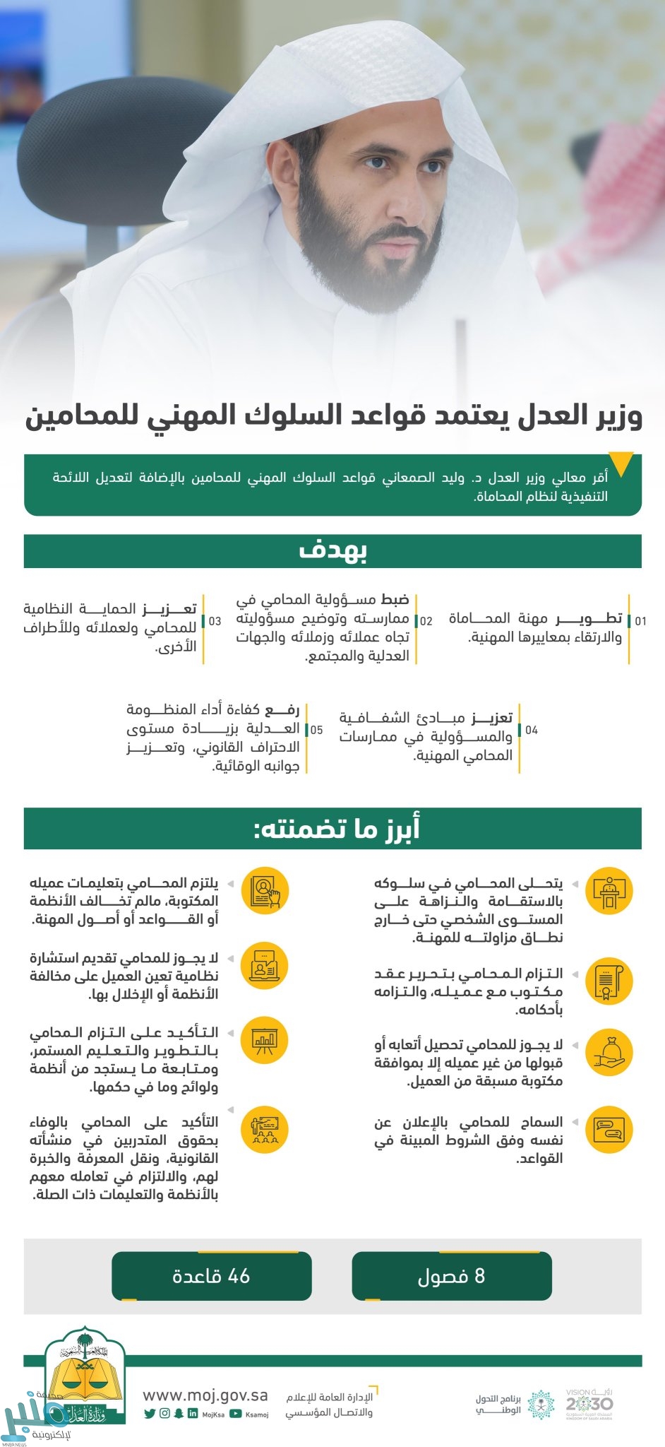 وارتكزت القواعد -التي صدرت في ثمانية فصول- على أحكام وقواعد عامة تضمنت تعريفات وإجراءات، إذ جاءت مؤكدة على أن يتحلى المحامي في سلوكه بالاستقامة والنزاهة، وأن يحرص على التطوير والتعلم المستمر، ويتابع ما يستجد من أنظمة ولوائح وقواعد وقرارات وما في حكمها في مجال المهنة، بما يمكّنه من مزاولتها بأقصى درجات المهنية.