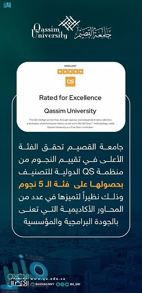 حققت جامعة القصيم الفئة الأعلى في تقييم النجوم من منظمة QS الدولية للتصنيف بحصولها على فئة الـ 5 نجوم، وذلك نظير تميزها في عدد من المحاور الأكاديمية التي تعنى بالجودة البرامجية والمؤسسية، بعد أن خضعت الجامعة لعمليات تقييم مستمرة وفقًا لهذه المعايير المحددة لفترات متكررة من قبل هيئة “كيو اس”، من خلال محكمين مستقلين، وإصدار تقارير دورية عن عمليات التقييم حتى الوصول للتقييم النهائي للمؤسسة التعليمية ومن ثم صدور النتائج النهائية.