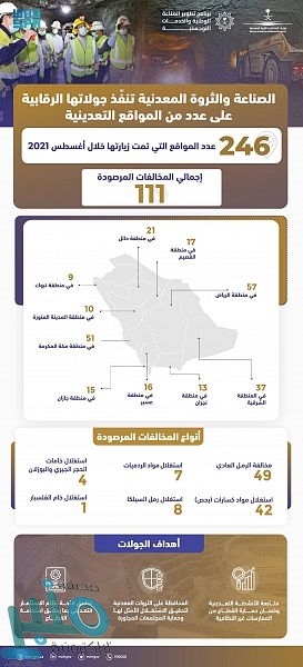 نفذت وزارة الصناعة والثروة المعدنية ممثلة بوكالة الرقابة التعدينية خلال شهر أغسطس الماضي 246 جولة ميدانية على مواقع الأنشطة التعدينية في مختلف مناطق المملكة، حيث رصدت ما يقارب (111) مخالفة لنظام الاستثمار التعديني، واتخذت الإجراءات المناسبة لها وفق اللائحة التنفيذية للنظام، بهدف حماية القطاع من الممارسات غير النظامية، وضمان استدامته.