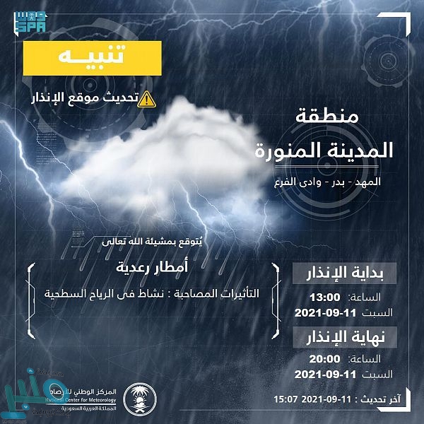 وأوضح المركز أن التنبيه الذي يشمل المدينة المنورة، ومحافظة الحناكية يستمر حتى الساعة الـ9 مساء.