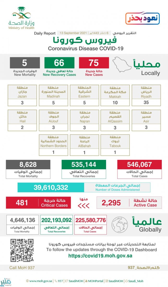 وأضافت الصحة أن إجمالي حالات المصابين في المملكة وصل إلى 546067 حالة حتى الآن ، ووصل مجموع المتعافين إلى 535144 حالة ، فيما بلغ إجمالي الوفيات 8628 حالة وفاة .