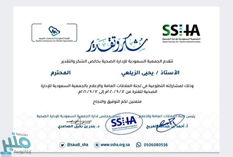 حصل يحيى موسى الزيلعي الموظف في قسم الصحة الإلكترونية بمستشفى القنفذة العام على شهادة شكر وتقدير من الجمعية السعودية للإدارة الصحية في الرياض على جهوده المبذولة ومشاركاته التطوعية الفعالة.
