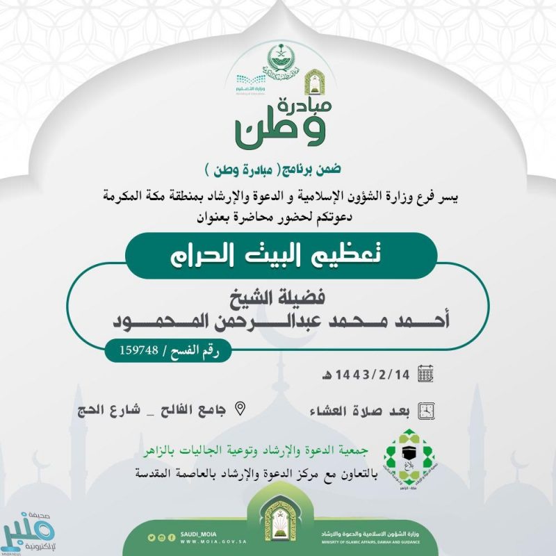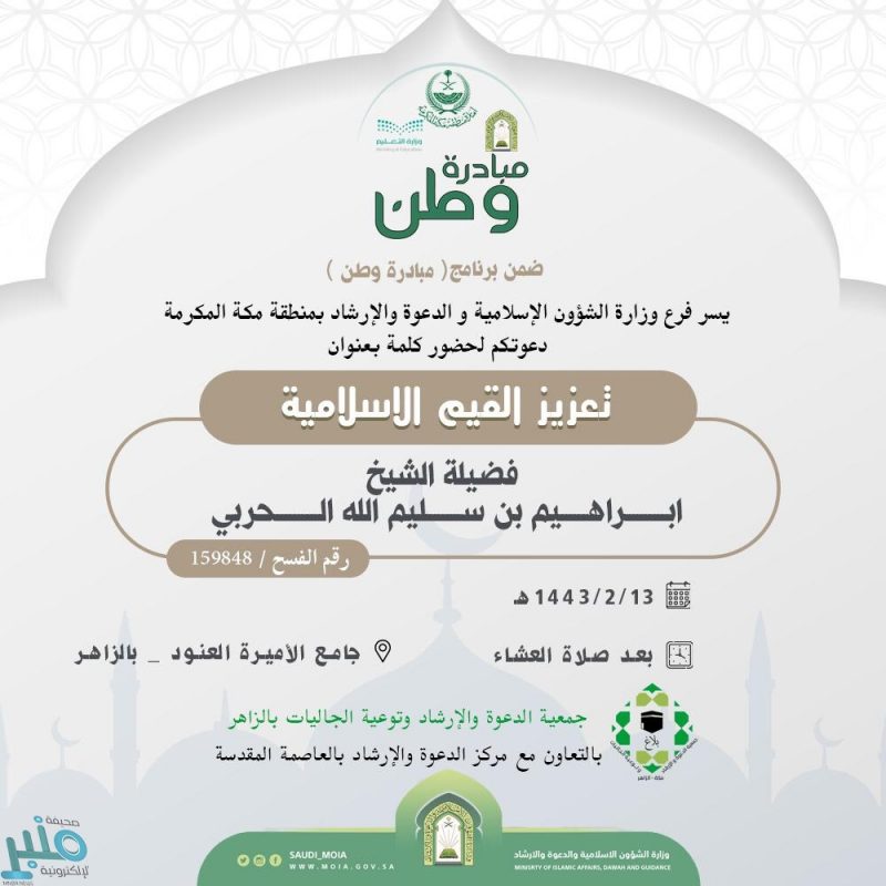 وفي منطقة مكة المكرمة، تواصل الوزارة تنفيذ “مبادرة وطن” في مساجد وجوامع العاصمة المقدسة، حيث تقام يوم غدٍ كلمة بعنوان: (تعزيز القيم الإسلامية) في جامع الأميرة العنود بعد صلاة العشاء، كما تقام بعد غد محاضرة بعنوان: (تعظيم البيت الحرام) في جامع الفالح بعد صلاة العشاء.