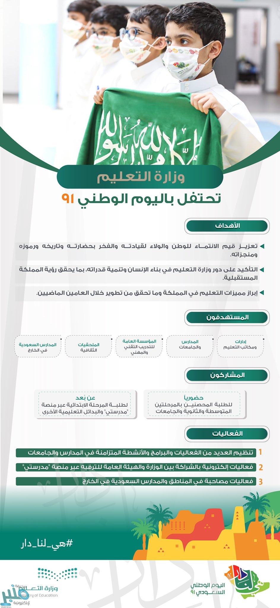 وتأتي الفعاليات والبرامج التي تقيمها وزارة التعليم احتفالاً بهذه الذكرى الغالية على قلوبنا تحت شعار “هي لنا دار” حضورياً بمشاركة الطلبة المحصنين وكافة الكوادر التعليمية والإدارية مع مراعاة الإجراءات الاحترازية الصحية المتبعة، وكذلك عن بُعد لطلبة المرحلة الابتدائية عبر منصة “مدرستي” والبدائل التعليمية الأخرى.