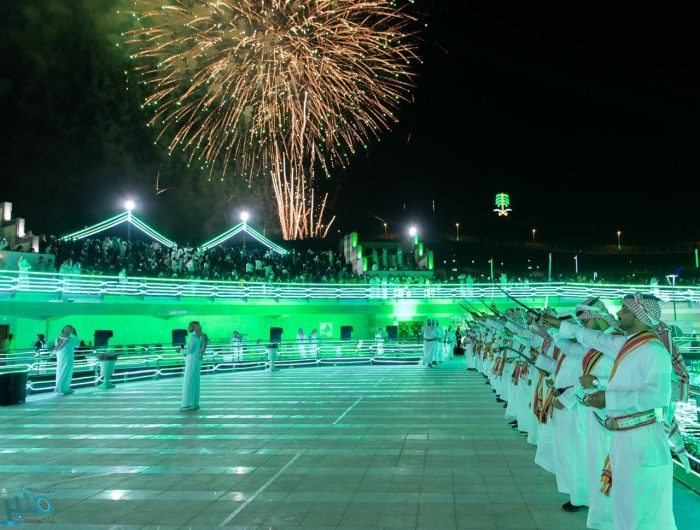 بعد ذلك شاهد سموه والحضور أوبريتًا غنائيًا وطنيًا، بمشاركة فرق للفنون الشعبية بالمنطقة، تضمن العديد من اللوحات تحكي تطور المملكة منذ تأسيسها إلى وقتنا الحاضر، وما شهدته الباحة من تطور وازدهار، فيما أضاءت الألعاب النارية سماء مدينة الباحة ومنتزه الأمير حسام بالقيم الذي اكتظ بالمواطنين من العائلات والأطفال والشباب الذين حرصوا على رفع أعلام الوطن وصور الملك المؤسس عبدالعزيز بن عبدالرحمن -رحمه الله-، وخادم الحرمين الشريفين وسمو ولي عهده الأمين.