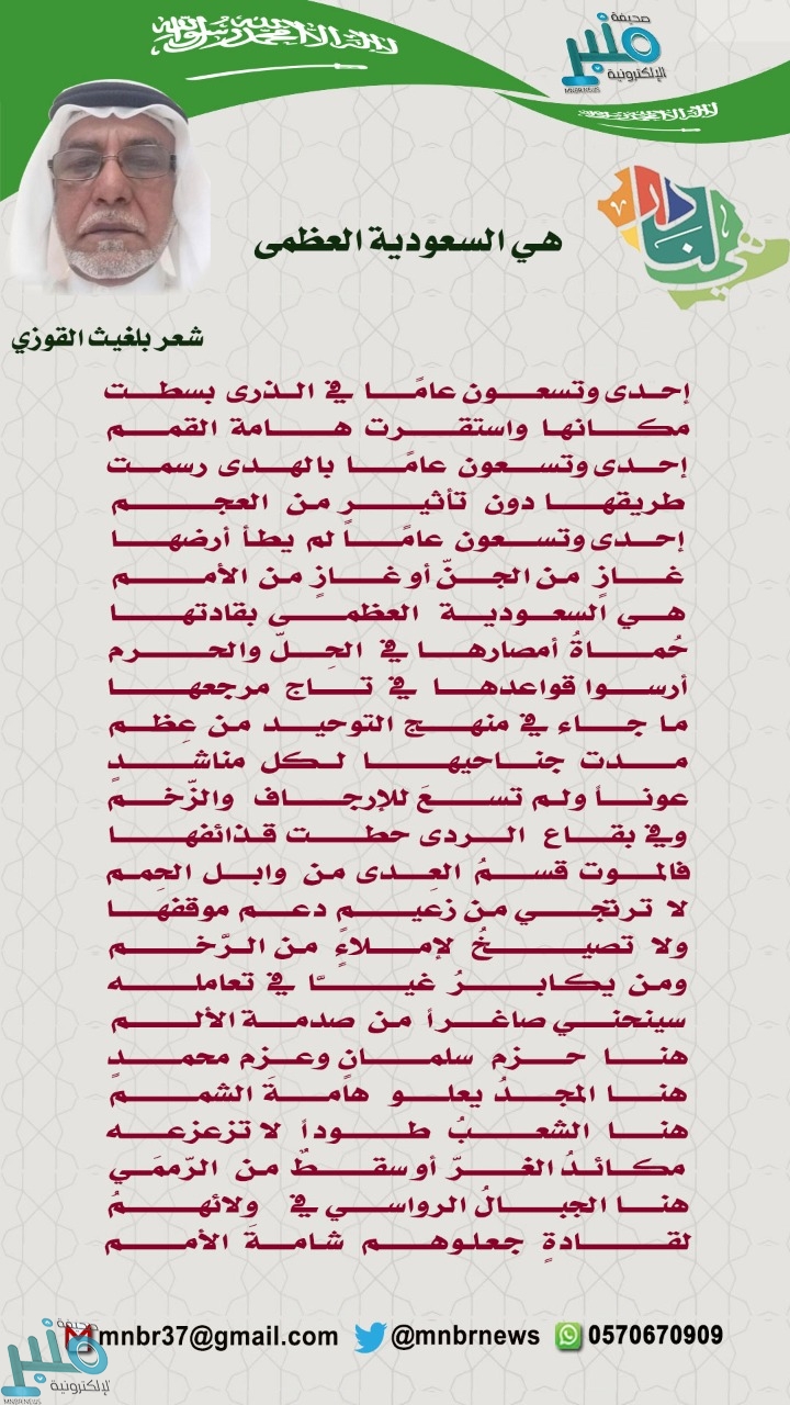 يمنح الأستاذ بلغيث بن حمد القوزي مدير تعليم القنفذة الأسبق للوطن في شعره المكانة الأولى دائمًا، وعندما يكتب للوطن فله عزف منفرد بموسيقى خاصة، تفوح فخرًا بالوطن واعتزازًا بأمجاده وولاءً لقيادته، ويرسل من كنانة شعره السهام إلى أعداء الوطن، معتمدًا على خبرته العلمية والعملية وروحه الوطنية.