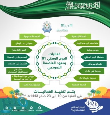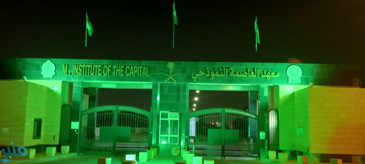 انطلقت فعاليات الاحتفاء باليوم الوطني ٩١ في معهد العاصمة النموذجي والذي سينفذ هذا العام تحت شعار ” هي لنا دار ” في الأقسام التعليمية بالمعهد . حيث توشح المعهد مساء يوم الخميس ٢٣سبتمبر ٢٠٢١م باللون الأخضر وتوزعت اللوحات التعريفية بالمناسبة في مرافق وطرقات المعهد.