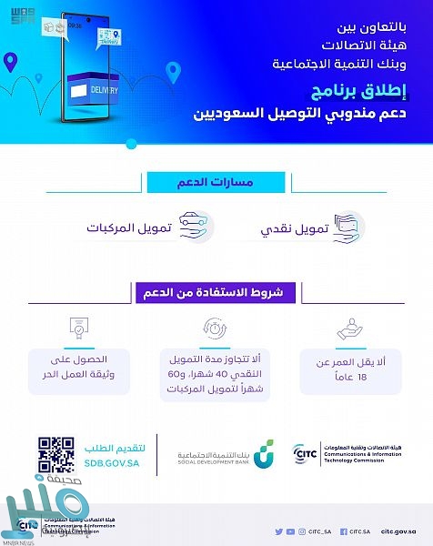 أعلنت هيئة الاتصالات وتقنية المعلومات وبنك التنمية الاجتماعية عن إطلاق برنامج دعم مندوبي التوصيل في التطبيقات المسجلة لدى الهيئة، الذي يجري خلاله تمويل مندوبي التوصيل السعوديين عبر تمكينهم من امتلاك مركبات خاصة أو تقديم دعم نقدي لهم للاستفادة بالعمل في تطبيقات التوصيل.