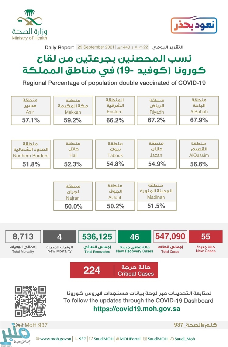 وأضافت الصحة أن إجمالي حالات المصابين في المملكة وصل إلى 547090 حالة حتى الآن، ووصل مجموع المتعافين إلى 536125 حالة، فيما بلغ إجمالي الوفيات 8713 حالة وفاة.