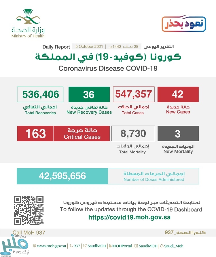 وأضافت الصحة أن إجمالي حالات المصابين في المملكة وصل إلى 547357 حالة حتى الآن، ووصل مجموع المتعافين إلى 536406 حالة، فيما بلغ إجمالي الوفيات 8730 حالة وفاة.