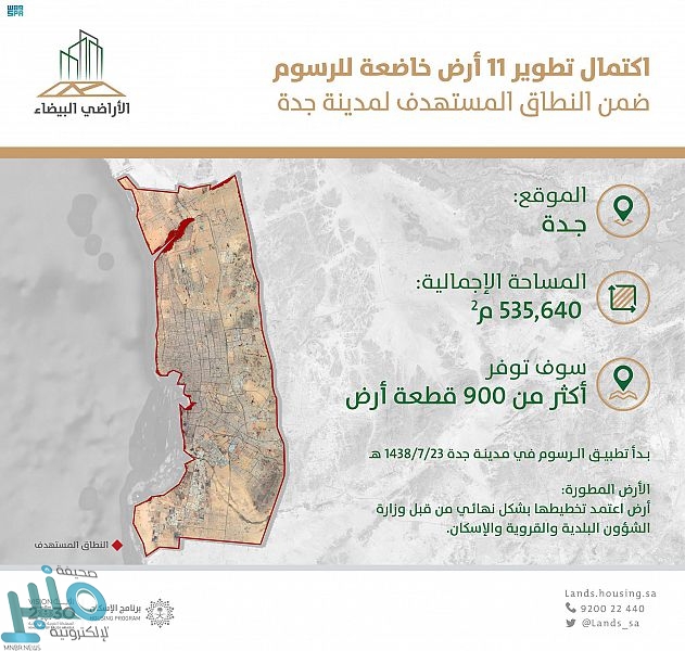 أعلن برنامج الأراضي البيضاء عن الانتهاء من تطوير 11 أرضاً خاضعة للرسوم من قِبل ملاكها في جدة, بمساحة إجمالية للأراضي المطورة تجاوزت 535 ألف م2، وذلك في إطار استهداف البرنامج دعم العرض, والإسهام في إيجاد سوق عقاري متوازن، حيث تُعنى المرحلة الحالية بالأراضي غير المطورة بمساحة 10 آلاف م2 فأكثر, الواقعة ضمن النطاق المعلن عنه عند إطلاق البرنامج في مرحلته الأولى عام 2017, والبدء في إصدار أوامر السداد (الفوترة).