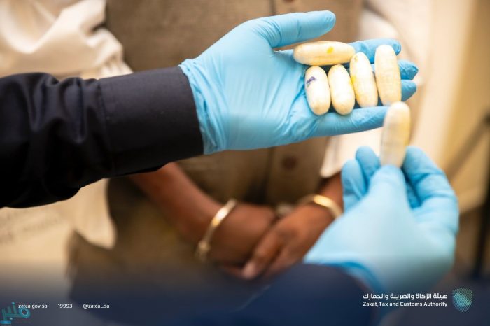 وأوضحت الهيئة أنه عند إجراء عملية التفتيش على ركاب إحدى الرحلات القادمة إلى المملكة عبر مطار الملك خالد الدولي اشتبه المفتش الجمركي من خلال تطبيق معايير الاشتباه بأحد ركاب الرحلة، وبتفتيش الراكب عُثر بداخل أحشائه على 91 كبسولة تحتوي على 855 جرام من مادة “الكوكايين”.