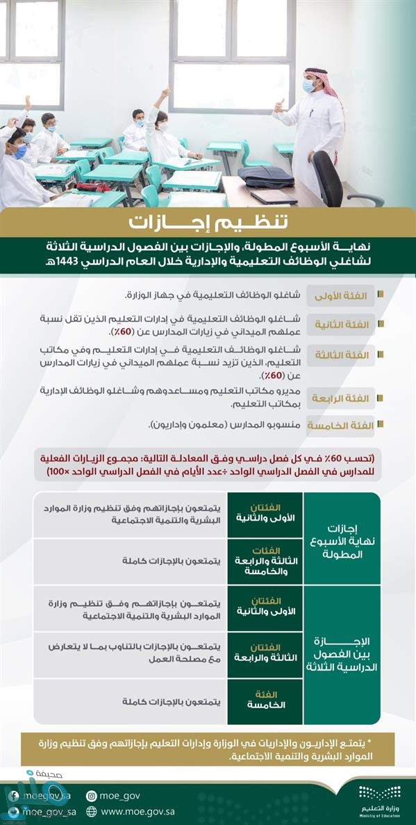 وبينت أن الفئة الأولى ستكون لشاغلي الوظائف التعليمية في جهاز الوزارة، ويتمتعون بالإجازات وفق تنظيم وزارة الموارد البشرية والتنمية الاجتماعية، بينما الثانية لشاغلي الوظائف التعليمية في إدارات التعليم الذين تقل نسبة عملهم الميداني في زيارات المدارس عن 60% ويتمتعون بالإجازات كاملة.