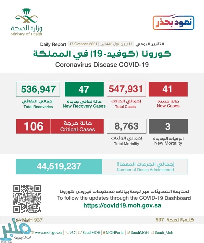 وأضافت الصحة أن إجمالي حالات المصابين في المملكة وصل إلى 547931 حالة حتى الآن، ووصل مجموع المتعافين إلى 536947 حالة، فيما بلغ إجمالي الوفيات 8763 حالة وفاة.