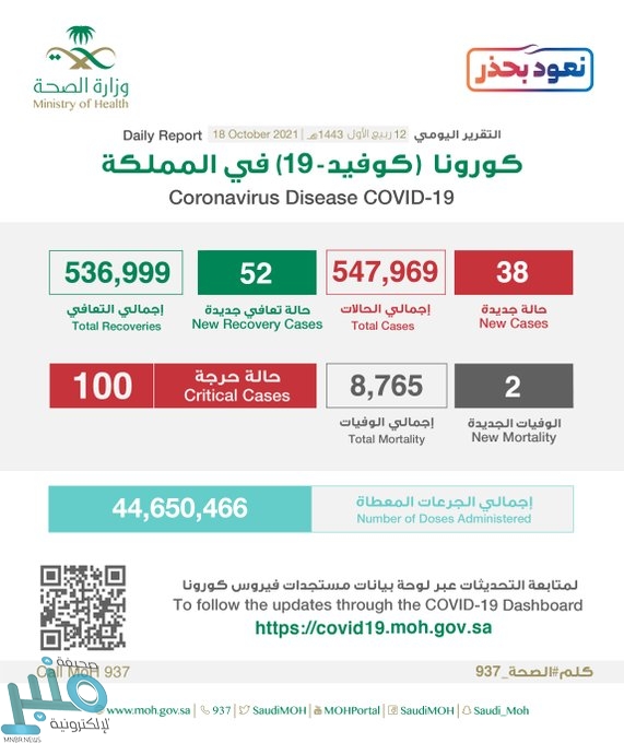 وبيّن التقرير أنه تم تسجيل 52 حالة تعافٍ جديدة، ليصل إجمالي عدد المتعافين إلى 536999 حالة، لافتة إلى أن هناك 100 حالة حرجة..