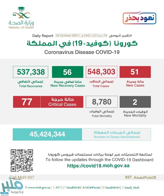 وأضافت الصحة أن إجمالي حالات المصابين في المملكة وصل إلى 548303 حالة حتى الآن، ووصل مجموع المتعافين إلى 537338 حالة، فيما بلغ إجمالي الوفيات 8780 حالة وفاة.