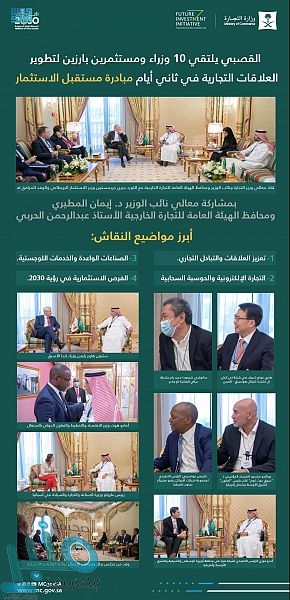 التقى معالي وزير التجارة الدكتور ماجد بن عبدالله القصبي، بحضور معالي نائب الوزير الرئيس التنفيذي للمركز الوطني للتنافسية الدكتورة إيمان بنت هبّاس المطيري، ومعالي محافظ الهيئة العامة للتجارة الخارجية الأستاذ عبدالرحمن الحربي بمجموعة من الوزراء والمسؤولين والمستثمرين على ضوء أعمال ثاني أيام مبادرة مستقبل الاستثمار في دورتها الخامسة التي تنعقد بالرياض خلال الفترة 26 – 28 أكتوبر 2021م.
