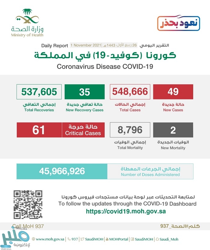 وأضافت الصحة أن إجمالي حالات المصابين في المملكة وصل إلى 548666 حالة حتى الآن، ووصل مجموع المتعافين إلى 537605 حالة، فيما بلغ إجمالي الوفيات 8796 حالة وفاة.