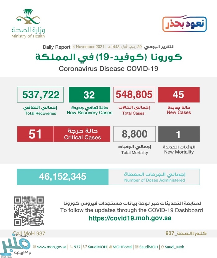 وأضافت الصحة أن إجمالي حالات المصابين في المملكة وصل إلى 548805 حالة حتى الآن، ووصل مجموع المتعافين إلى 537722 حالة، فيما بلغ إجمالي الوفيات 8800 حالة وفاة.